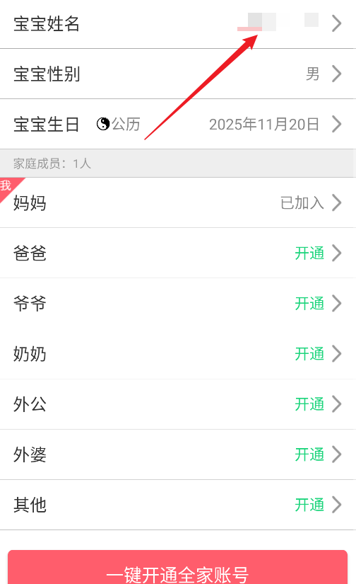 2、在家人列表中找到宝宝的姓名,点击进入编辑界面。