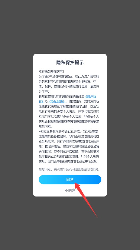 1、初次使用需完整阅读平台服务条款与隐私政策,确认后点击同意按钮进入应用。