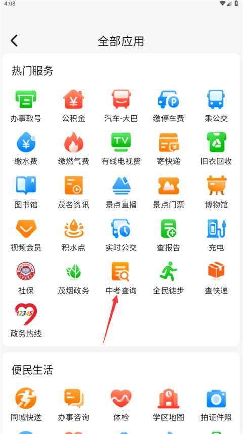 2、找到中考成绩查询服务进入。