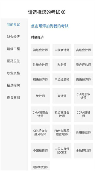 2、用户们打开app首页设有清晰的考试名称选择入口,你可以根据自己的考证计划,精准选择对应的考试名称。