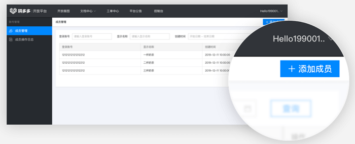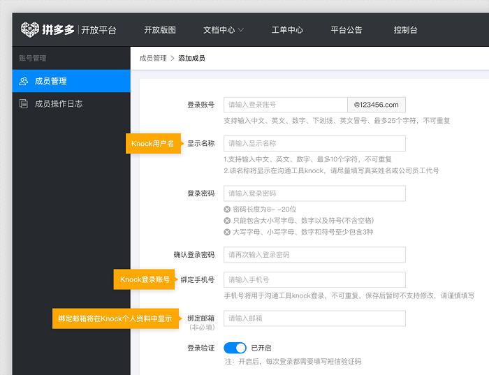 1.注册并且通过资质审核的商家或服务商,可以使用注册开放平台的手机号(即主账号)直接登录软件,与拼多多工作人员进行沟通;如果公司还有其他的人员有此需要,也可以使用主账号在“开放平台-个人中心-成员管理”模块,创建相应的子账号并为子账号赋予权限(如无权限也可不赋予),保存成功后该子账号绑定的手机号可直接登录knock,与拼多多工作人员进行沟通,具体流程如下图: