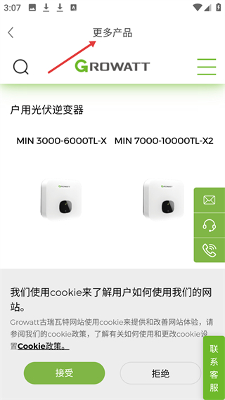 3、 GROWATT产品页,展示户用光伏逆变器系列,属更多产品板块,让用户了解其光伏逆变器产品。