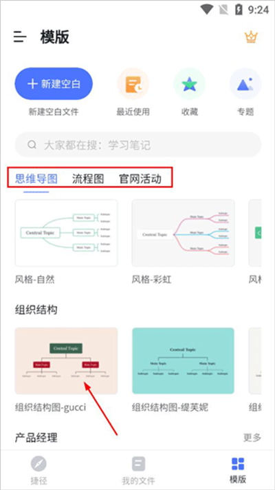 1.打开ProcessOn思维导图,有捷径、我的文件、模板等版块,模板里可以选择多种思维导图、流程图样式。