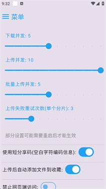 答:进入app页面点击右上角“菜单”->"设置",即可调整上传下载并发数量等功能。