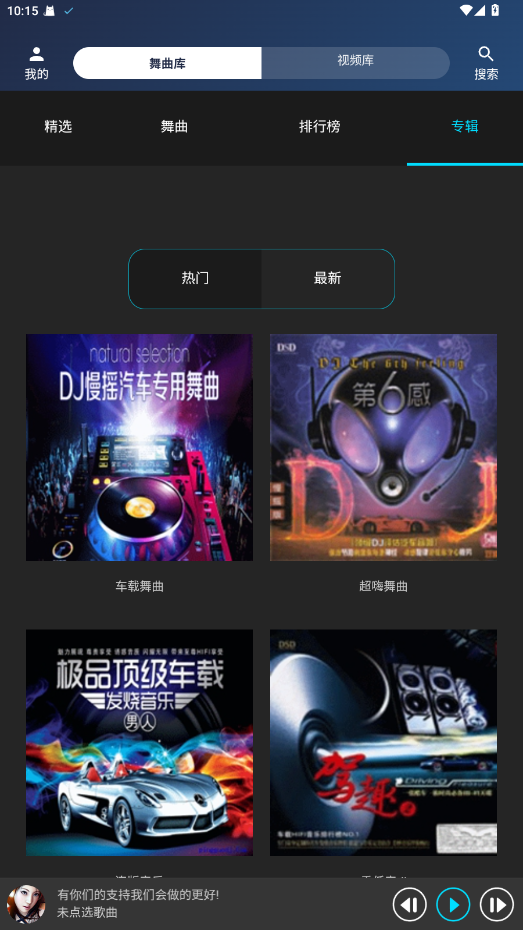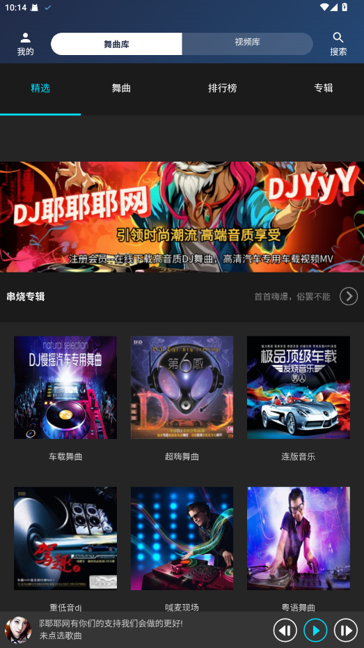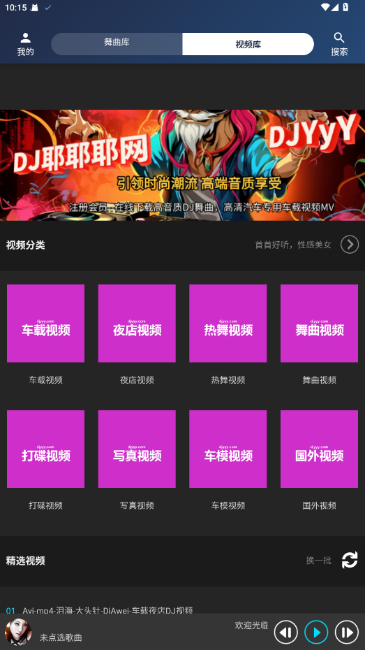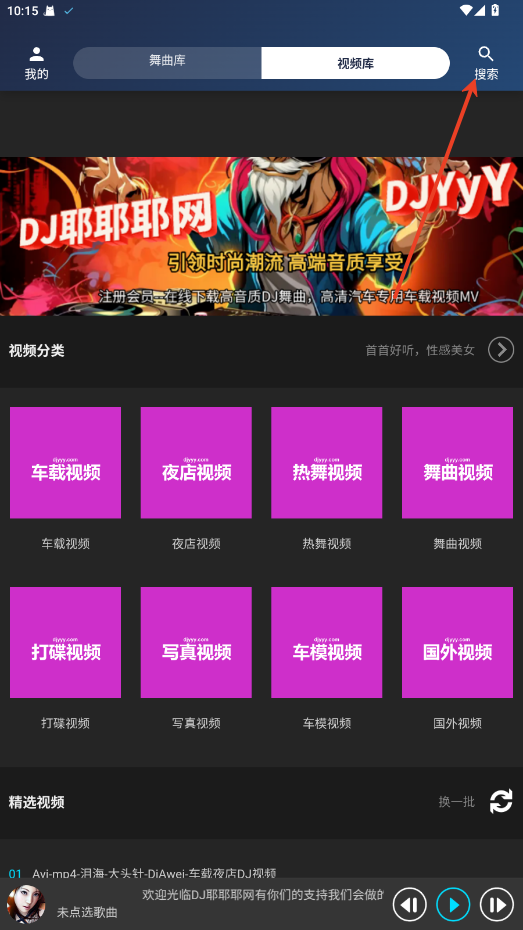 3.在“视频库”栏目中,用户可以观看DJ现场表演、打碟视频、舞曲视频等内容。视频库分类丰富。