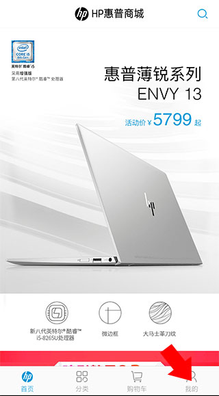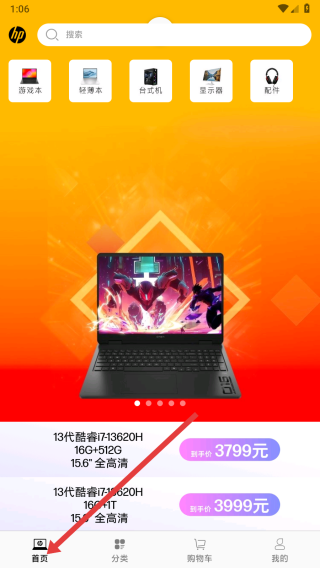 2.首页界面顶部有搜索栏和产品分类快捷入口,首页重点推荐惠普笔记本,如13代酷睿i7配置机型,标注到手价,吸引用户关注。