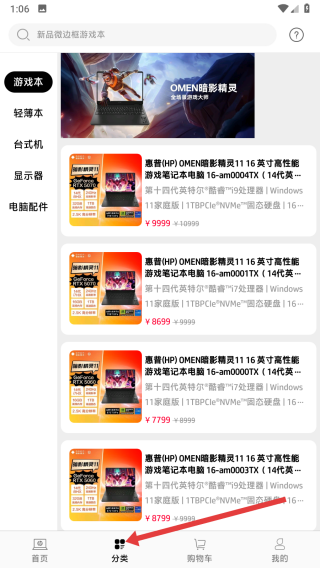 3.分类页面清晰划分游戏本、轻薄本、台式机、显示器、电脑配件等品类,以游戏本为例,展示多款OMEN暗影精灵产品。