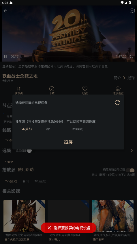 2、在视频播放界面,点击右上角【TV】按钮,在选项页面中点击【投屏】按钮;