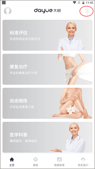 2.打开“大悦盆底”主界面,点击右上角的蓝牙图标,确保手机蓝牙及定位已经打开。