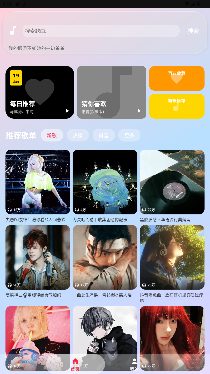1.在主页上,用户可以根据分类(如新歌、热歌、抖音等)浏览各种音乐,发现新的歌曲。