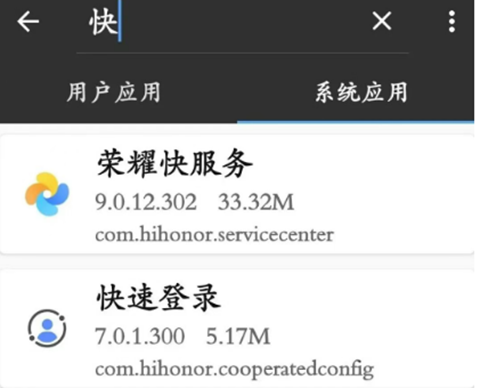 2)MT管理器来查找要卸载的软件代号,(或者百度搜索)。如下图,我要卸载的是'荣耀快服务',其代号为‘com.hihonor.servicecenter’