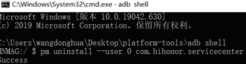 3)在控制台输入'pm uninstall --user 0com.hihonor.servicecenter',然后系统返回Success,这样就卸载完成了。要卸载其它软件原理相同