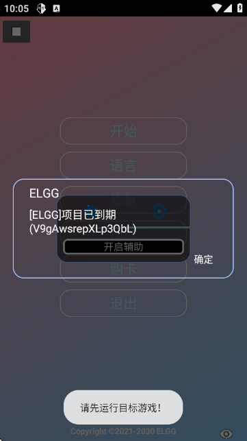 4.当项目到期时,会弹出“[ELGG]项目已到期”的通知,点击“确定”后提示需先运行目标游戏。