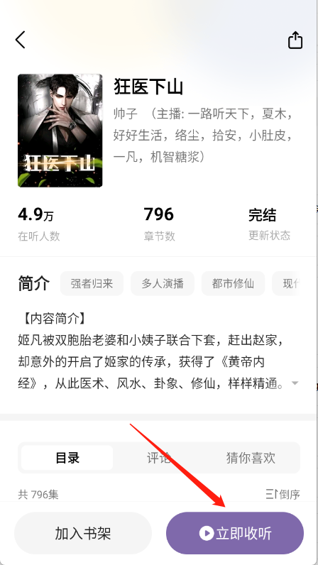 4、用户点开想听的书源进入详情页,点击“立即收听”。