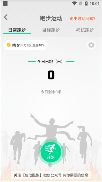 3. 点击「开始跑步」按钮,进入跑步运动页面,在此选择日常跑步或目标跑步后点击「开始」即可记录。