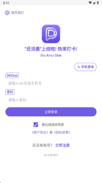 1、在本站下载安装好dkchat,点击下方的【立即注册】按钮,进入账号注册流程,输入昵称、手机号、验证码等信息,设置好密码;