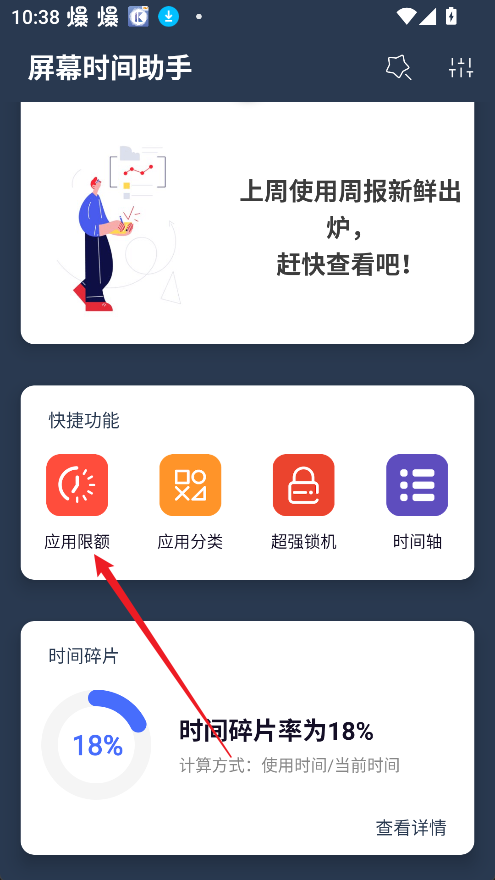 1、打开屏幕时间助手,向下滑动页面,进入应用时长限制功能区域。