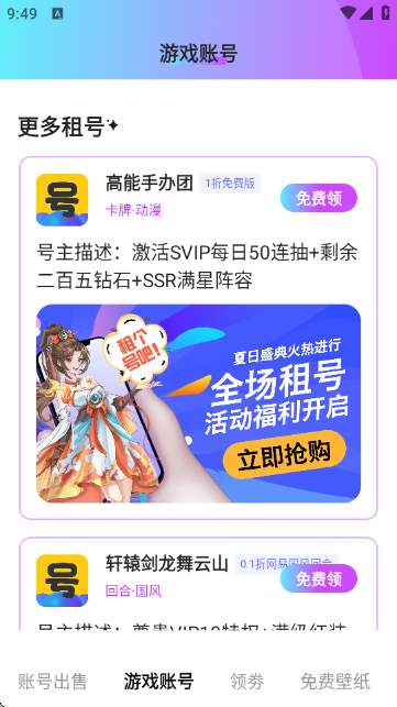 4.返回主界面,切换至“游戏账号”页面,可浏览推荐的租号活动,例如“高能手办团”或“轩辕剑龙舞云山”的限时优惠租号服务,并点击“免费领”参与活动。