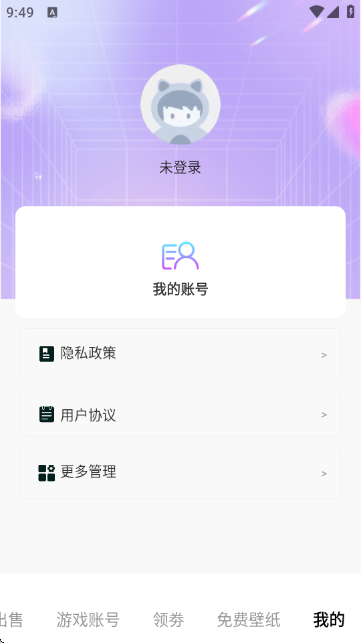 7.最后点击底部“我的”选项,进入个人中心页面,可进行登录、查看隐私政策、用户协议及更多账户管理操作。