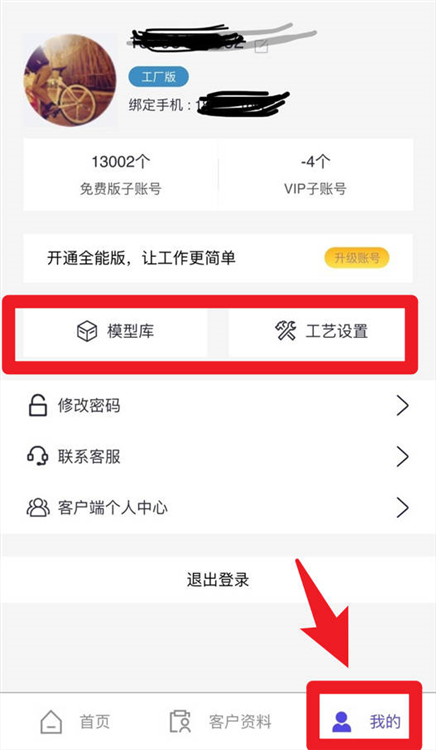 5.点击我的页面,可以查看模型库和工艺设置,同时支持修改密码、联系客服等操作。