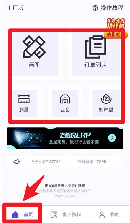 3.进入首页,可以看到画图、订单列表、测量、云仓和知户型等主要功能模块,点击即可快速使用。
