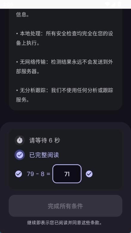 3、等倒计时结束后,勾选“已完整阅读”选项,再完成一道简单的算术验证题(比如79减8等于71这样的),最后点击“完成所有条件”按钮就能进入主界面了。