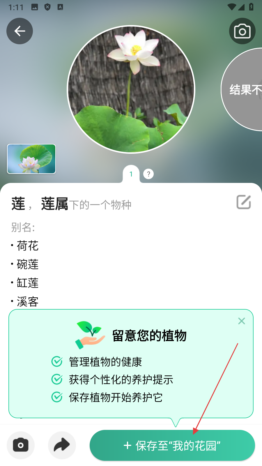4.于植物识别结果页面,点击【保存至我的花园】选项,就能完成植物识别以及保存的相关操作。