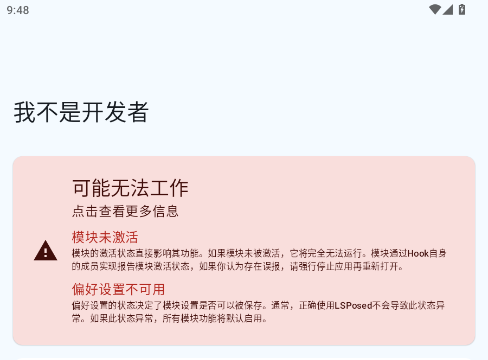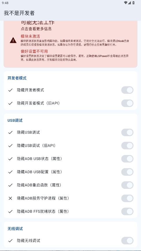 3、打开我不是开发者模块功能界面,按需开启隐藏开发者状态、屏蔽提示等功能,重启对应应用即可生效。