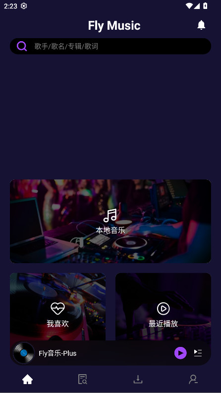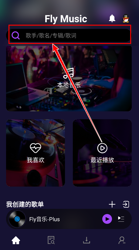 1.打开fly音乐plus,点击首页的搜索框。