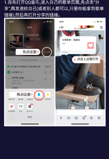 3.首先打开QQ音乐,进入自己的歌单页面,先点击“分享",再发送给自己(或者别人都可以,只要你能拿到歌单链接),然后再打开分享的链接。