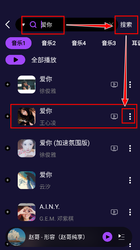 2.输入歌手/歌名/专辑/歌词,在这里小编以搜索爱你为例。接着点击搜索,点击我们想要的歌曲版本后面的三个点。