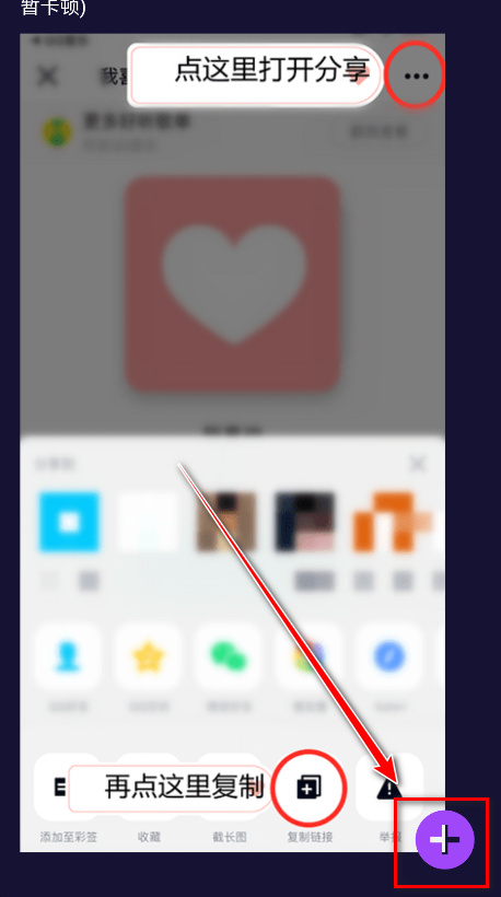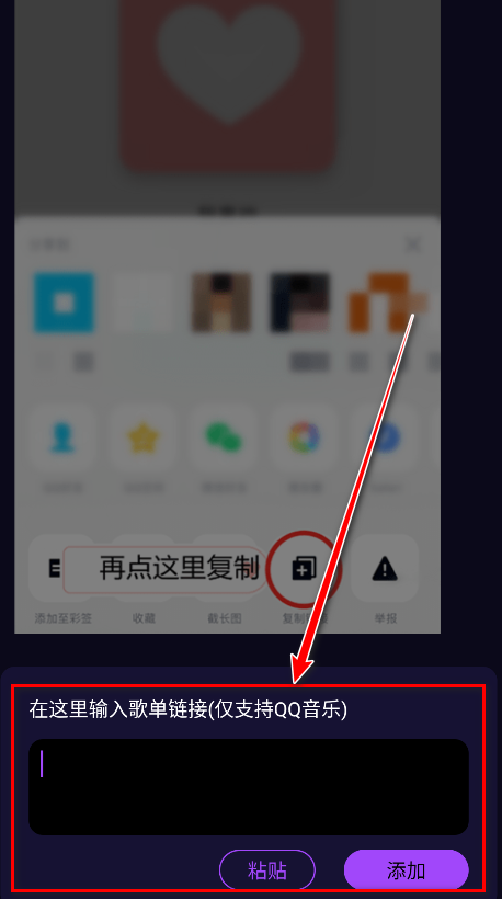 4.点击打开以点击右上角,复制链接,再到这里点击右下角的按钮粘贴。(提示:超过500首歌曲的歌单可能会短暂卡顿)