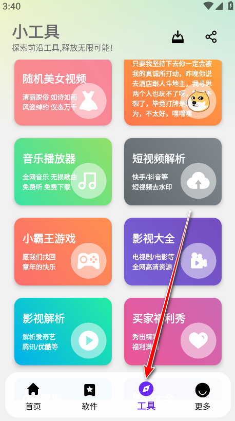9.点击工具,可以看到这里有着音乐播放器、短视频解析、影视解析、小霸王游戏等板块内容,大家对哪个板块感兴趣就直接点击进入使用哈。