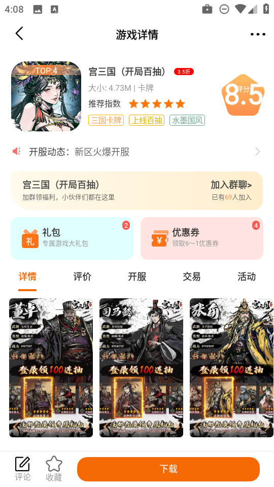 3、任意选择一款游戏,这里以【宫三国】游戏为例,直接点击【下载】。