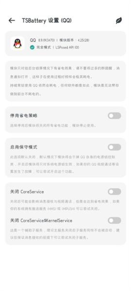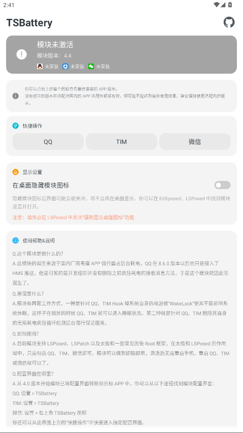 TSBattery 模块 Xposed 版 是一款专为安卓 QQ 用户设计的省电工具,旨在优化 QQ/TIM 的后台耗电表现,并有效停止不必要的推送通知。该模块开源免费,支持多框架,能够帮助用户节省手机电量并提升使用体验。适用于安卓设备,特别是希望 QQ 更省电的用户。在使用时,务必遵循模块的相关规则,确保最佳效果。不同版本提供不同的优化内容和功能,持续更新。