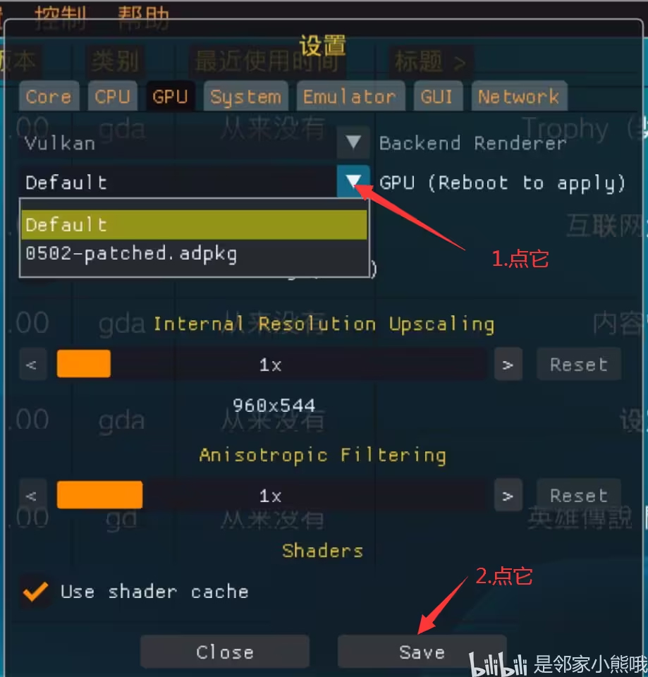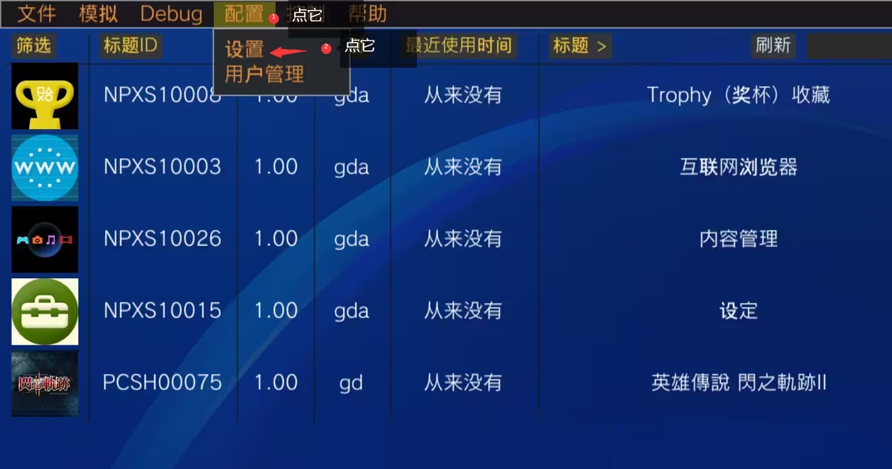 点击“配置”→“设置”,点击上方的GPU,点击下边的Add custom driver(添加自定义驱动),找到PSV文件夹中的驱动程序(注意,群里的是一个压缩包,自行解压,里边的好几个文件夹才是驱动,好几个文件夹里的那些驱动不用解压!!!不用解压!!!不用解压!!!),找到合适的驱动,点击它,在GPU(Reboot to apply)左边的箭头处,即可选择你弄得驱动。可以添加多个,自行选择。最后点击下方的Save(保存),再点击左边的Close(关闭)即可。