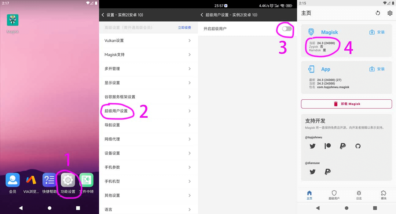 2、功能设置 – 超级用户设置(开启)- Magisk支持(开启)- Vulkan设置(开启)