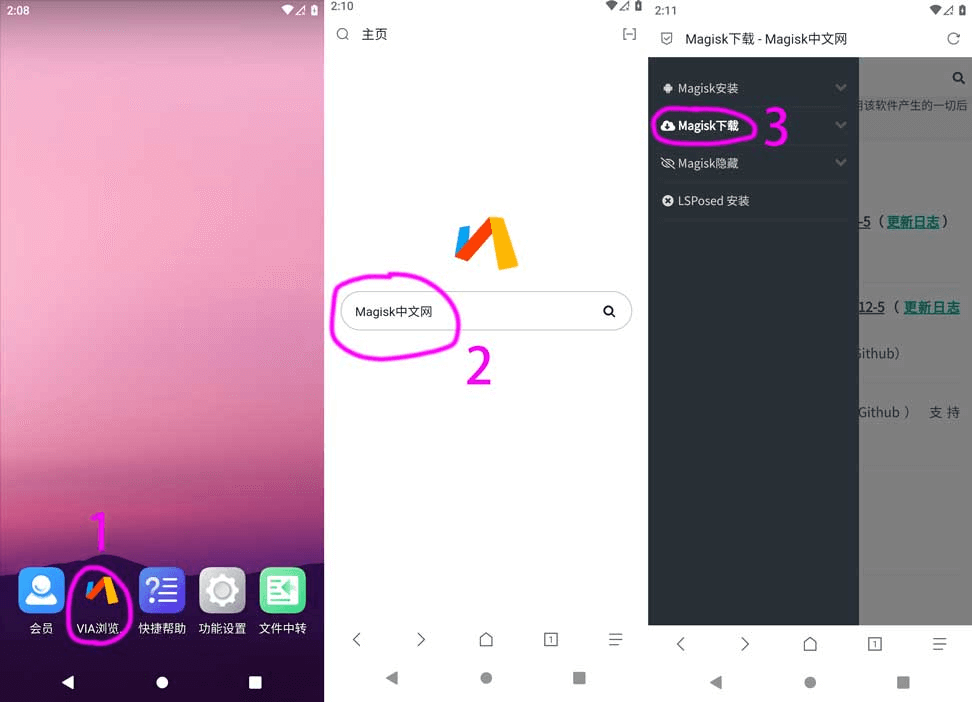 3、打开Via浏览器 – 搜索 Magisk中文网 – 下载稳定版Magisk – 安装Magisk