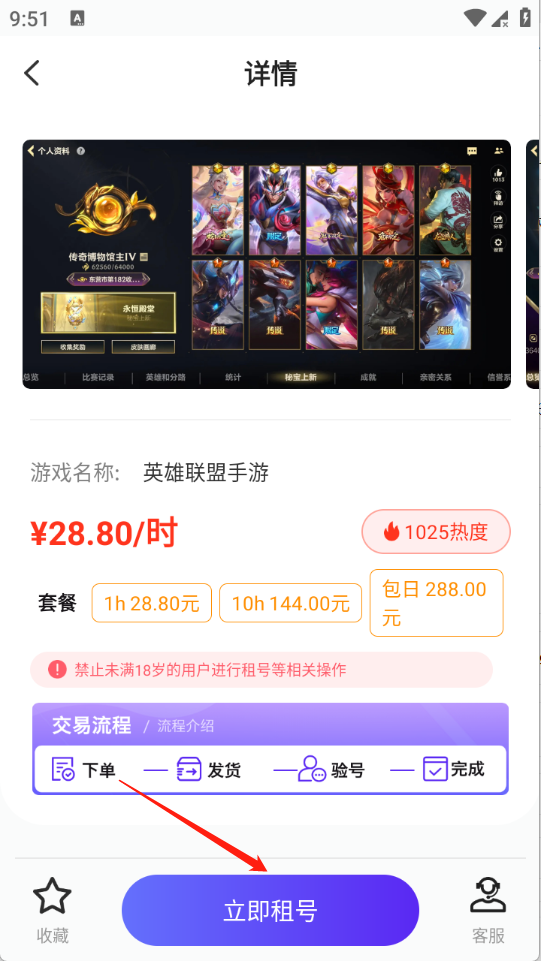 5、点开想要租用的账号进入详情页,点击立即租号即可。