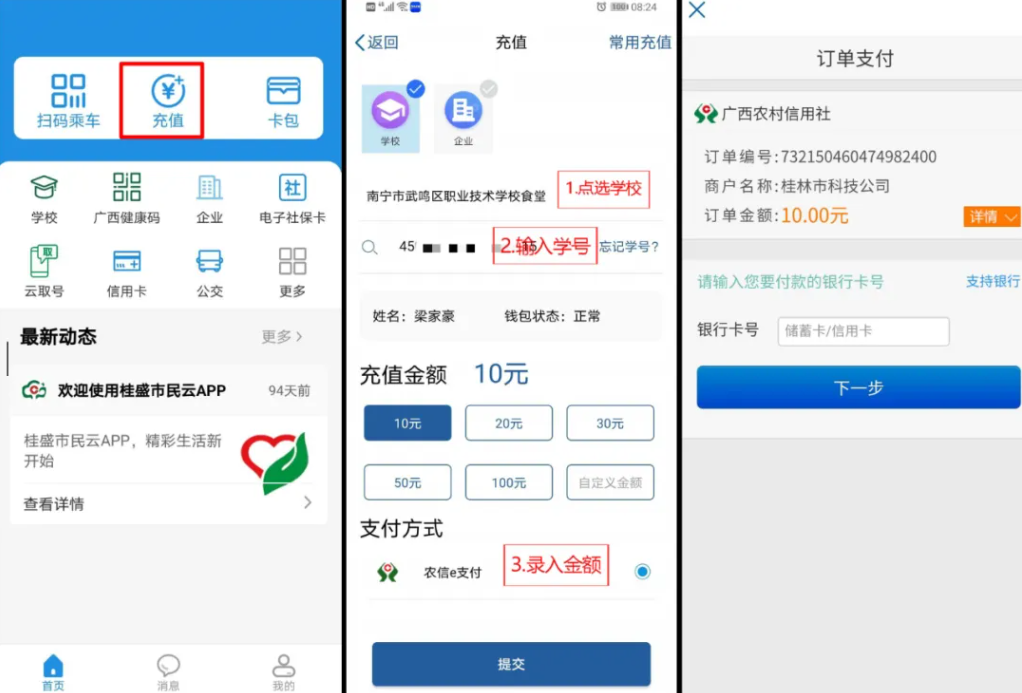 桂盛市民云怎么充值饭卡