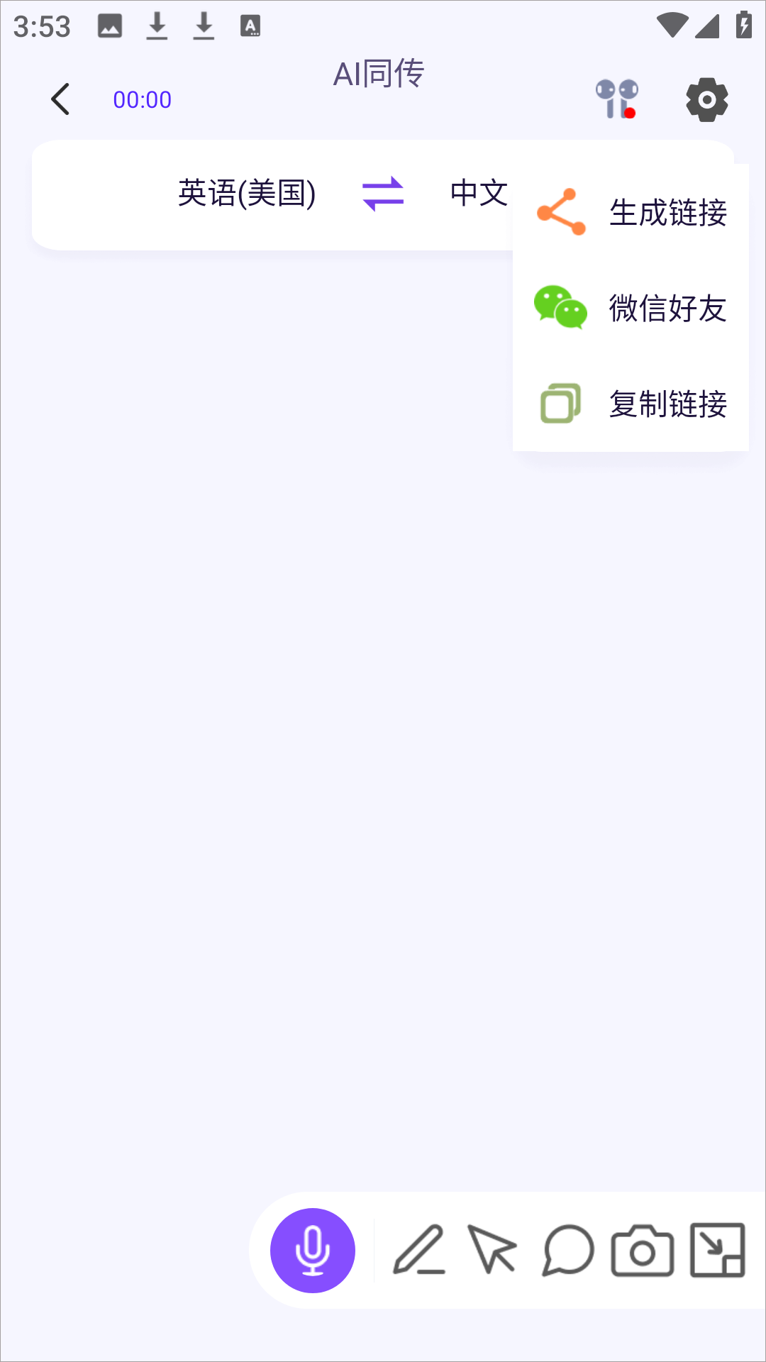 3、点击同声传译进入使用界面,选择对方的语言,和自己的语言,对方会议发言开始的时候,点击中间的会话键,就可以开始工作了。