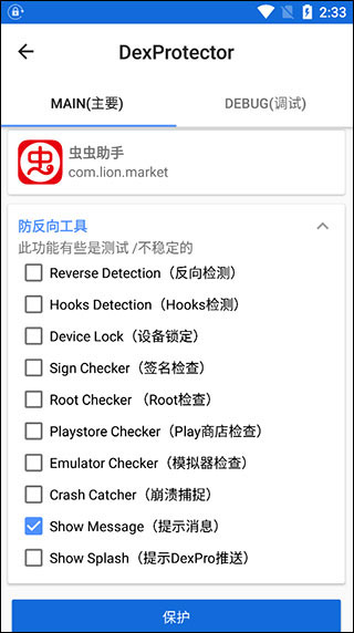 4、你可以勾选你所需要的选项进行保护,勾选完点击保护即可,随后就会对程序进行一系列的操作。