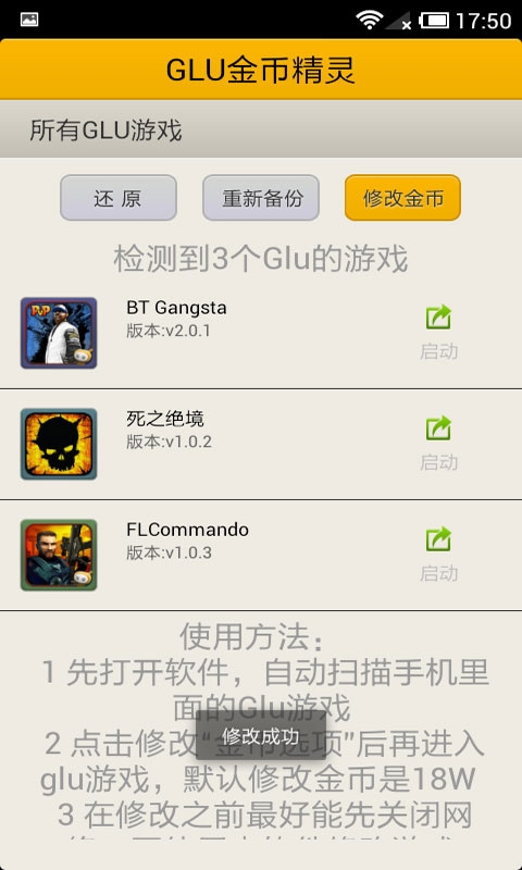 2. 每次运行软件,手机里的游戏金币数量会变为18万,能快速获得海量金币。
