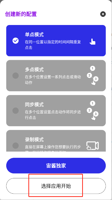 3、选择点击模式,选择应用开始。