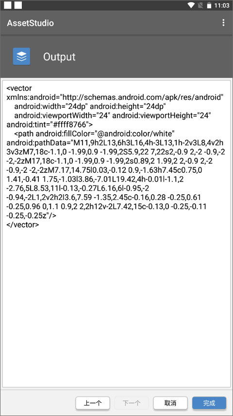 5. 能将矢量图转换为安卓可用的VectorDrawable,还可自由选择asset类型并调节透明度,且转换效果比网页转换工具好。