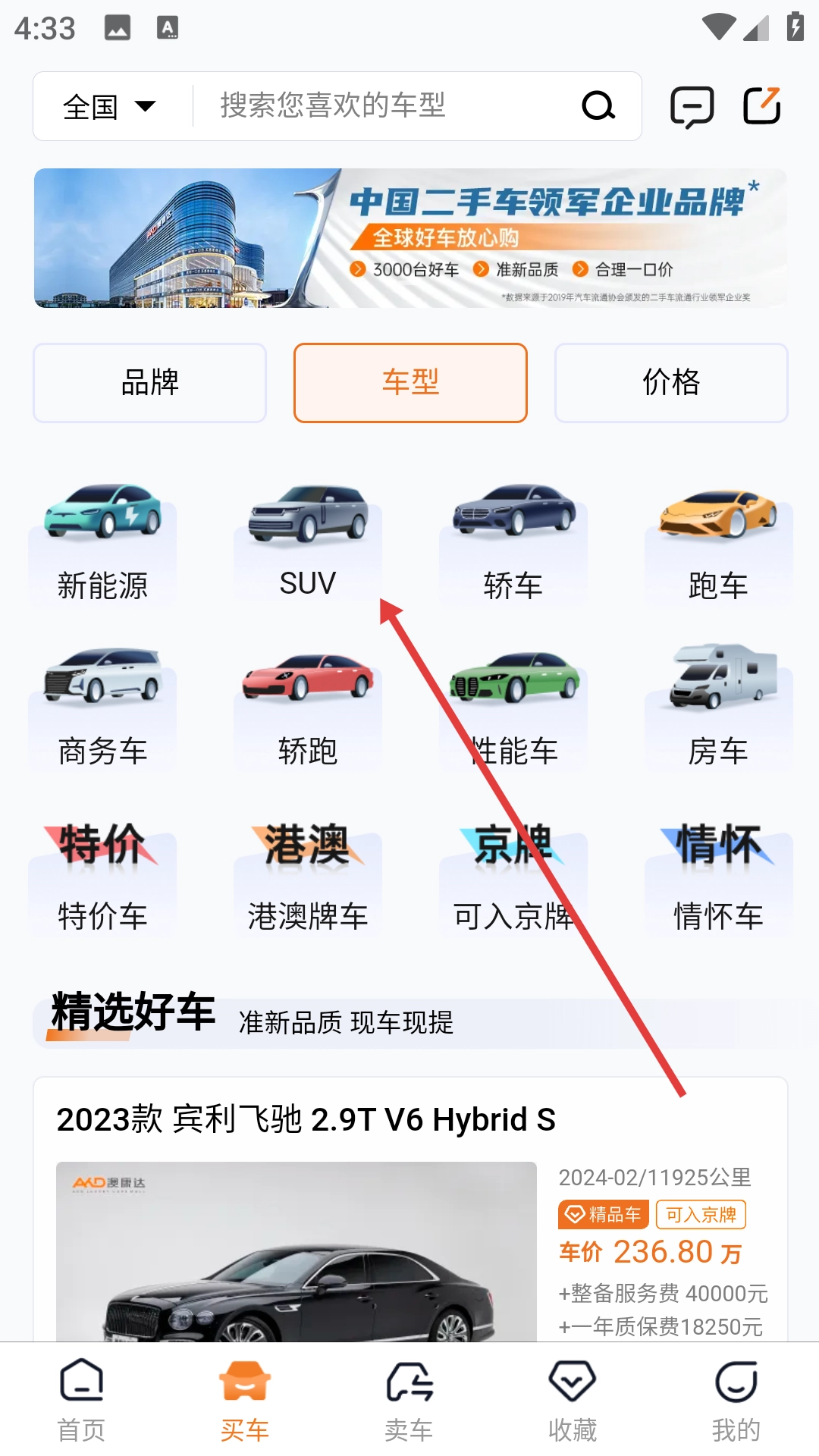 3、进入车型选择页面后,点击【SUV】选项,即可筛选出所有SUV车型。
