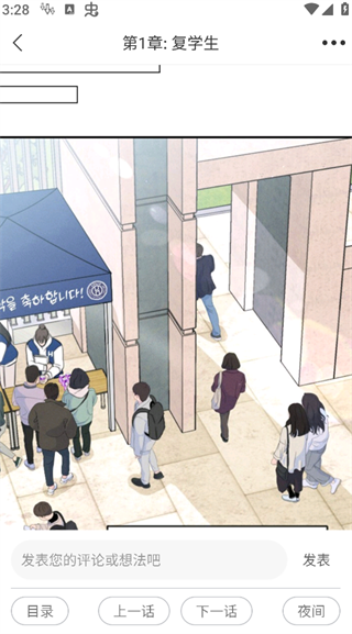 在小说正文页,点击屏幕底部会弹出“目录”以及“上一话/下一话”按钮,支持章节快速切换。输入框可供用户发表评论,便于与其他读者互动交流。