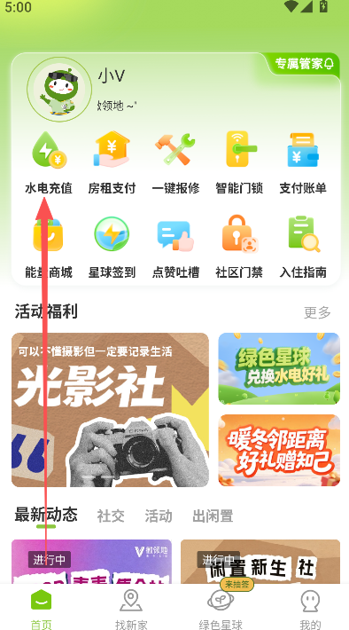 2、来到首页以后,选择上方的水电充值开始操作。