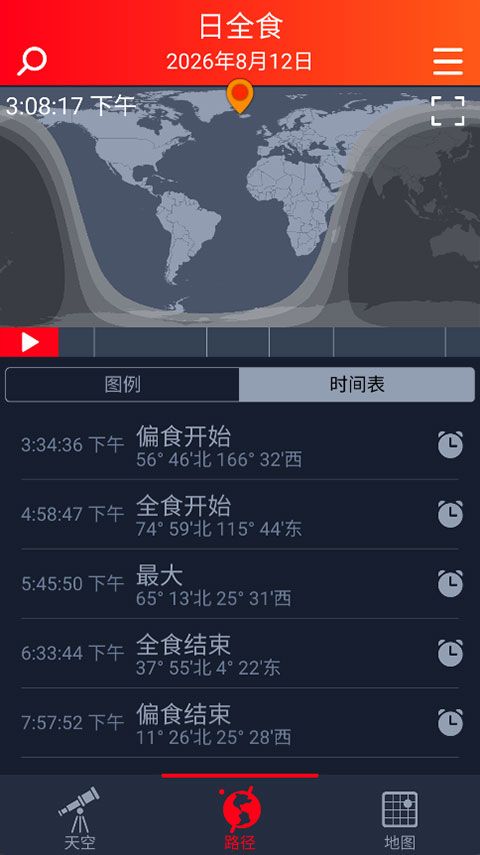2、路径追踪: “路径”界面通过全球地图直观展示食带走向,帮助你了解日食在世界各地的起始时间与地理坐标。