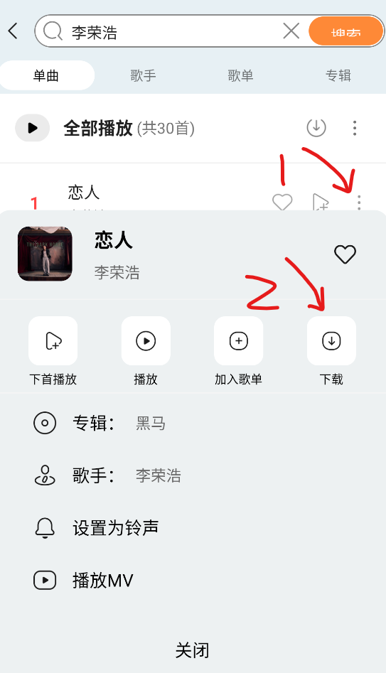 4、点击歌曲右侧的三竖点,然后点击下载,即可开始下载歌曲